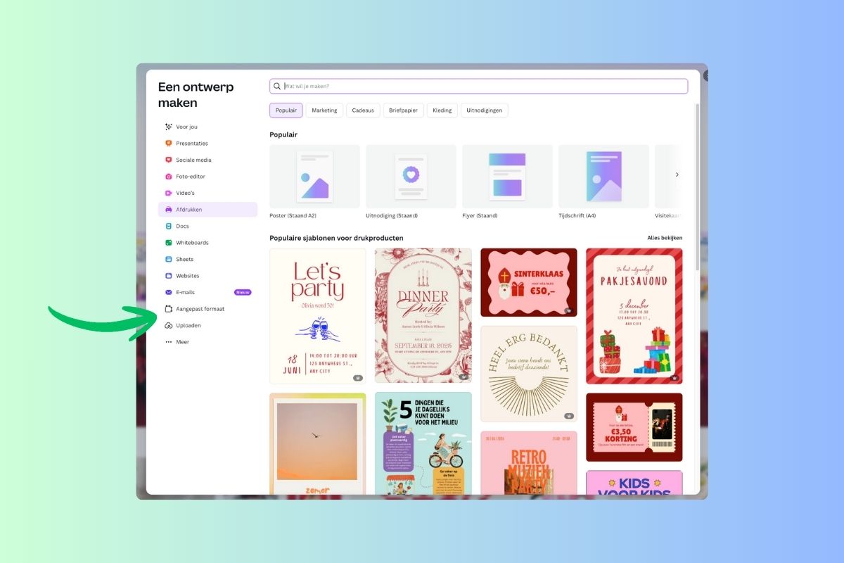 Maak in Canva een nieuw ontwerp aan en kies voor een aangepast formaat in millimeters. Voor A4 gebruik je 210 bij 297 mm (breedte x hoogte) en voor A5 gebruik je 148 bij 210 mm. Je kunt onder Aangepast formaat (zie hieronder) ook zelf een formaat invoeren. Controleer altijd of je werkt met het gesloten formaat, dus de brochure zoals hij eruitziet wanneer hij dichtgevouwen is.
